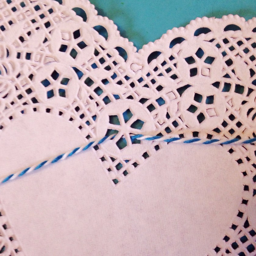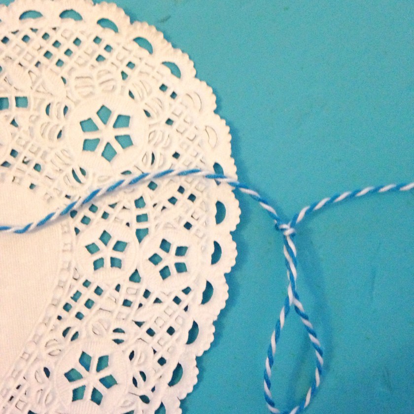 Turn the doily around so that you can’t see the color. (If it’s white it won’t matter which side) Thread the twine through one of the holes in the doily.
