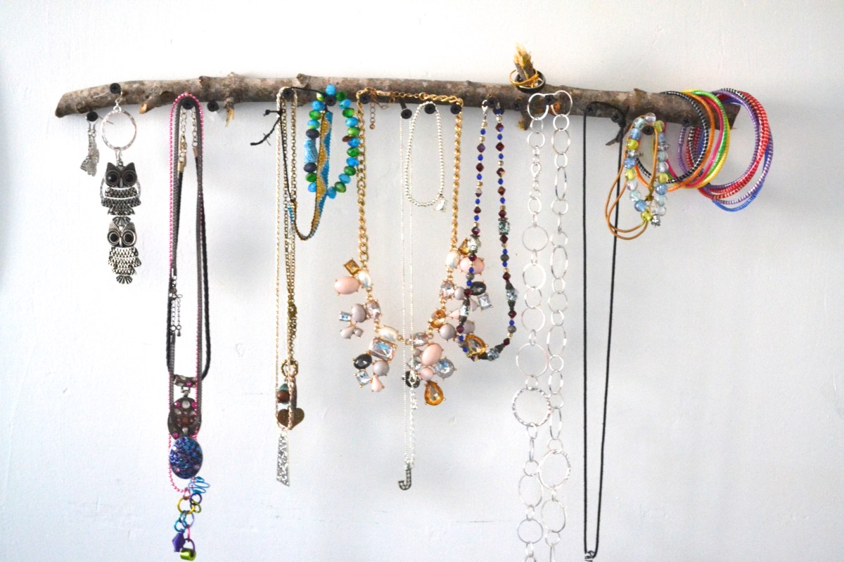 Place the branch on the wall, and add your jewelry! This is the fun part! 🙂 If your stick has little tiny branches sticking out of it, like mine does, you can add rings to it! I also hung some earrings from it, too.