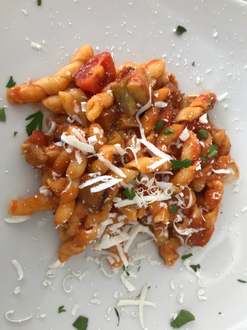 After the tour at the Valle dei Templi, we went out for lunch. I got a classic Sicilian pasta dish: Pasta alla Norma. It’s busiate (my new favorite pasta) with tomatoes, eggplants, basil, and cheese.