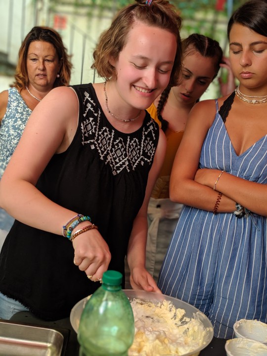 After lunch in Amelia, we headed back to Narni for a cooking class. We made a pasta salad and tiramisu, and there was also a meat dish with prosciutto I can’t remember the name of. Here’s a picture of me cheesin’ it up while I mix the mascarpone…
