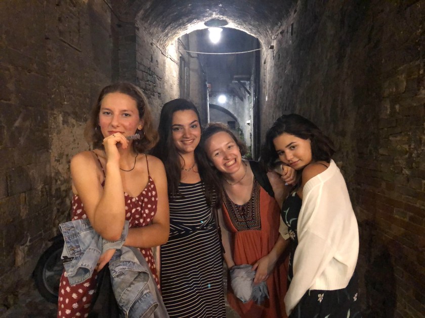 After dinner, we returned to the hostel and got ready for a 9:30 performance we would be attending. This was the first of many shows/concerts we went to, and it was quite interesting. It was called “To The Moon,” and, because it was in Italian, I didn’t understand all that much. I can tell you that it was about the first moon landing and that there was beautiful piano music throughout. Here’s a photo of us before the show: