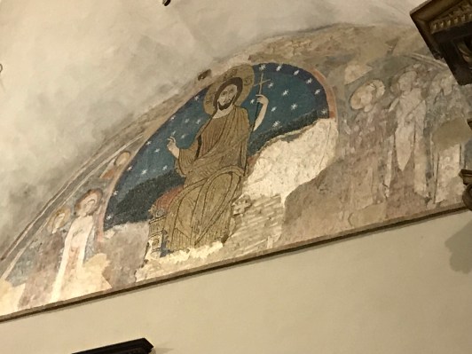 This is one of the painted pillars of Chiesa di San Francesco. I have no idea whose hand that is, but I think it makes the photo a little more interesting 🙂This is the outside of Palazzo Comunale di Narni which, from what I remember, is the main governmental building within the town. This is also where we met the mayor of Narni a couple of days prior.Some really intricate detailing on this otherwise generic structure.Ahhhh. This photo takes me back. We walked this stretch every day to and from the hostel. It was right in the center of town, and it was always filled with people.Here’s a headshot-like photo of the Pope right near the entrance of the Cathedral of Saint Juvenal. This was the one we went to mass in, and it was my favorite of all the churches.Incredible floor mosaic.Here’s Mary in one of the corners of the church.Excuse this blurry picture. Our tour guide said that this corner near the ceiling was the only piece of mosaic (besides the floor) within the church. I found this science journal that has some cool info on its preservation and history if you’re interested.This is one of the most beautiful pieces of art I’ve ever seen. I’m not sure what it is about it — maybe it’s the mid-century looking wings around the frame or the glitter star that was added to the woman in the painting — but I couldn’t stop staring at it. And even now looking at the pictures, it takes my breath away! So gorgeous.Here’s an up-close shot of it. I really want to learn more about this piece of the church but can’t find any info online. If you find anything, please share it with me! I love the mix of styles so much and would really like to know who the artist (or artists) is.Here’s the side of the same wing. I love the rose design up near the ceiling and those long lines that match the wings on the golden frame.Here’s another part of the church (sorry for my lack of church geography terminology!). It was really hard to believe that we had mass in here because we didn’t see any of the insane details until we actually took the tour.This area in the very front of the church is all marble.This is right above the stairs that lead to the marble. When I attended the mass, this was mainly all that I could see. It’s still incredible, but I am so happy I saw the rest of the church or I would have missed out big time!Alright, this is from another church: Santa Maria Impensole. It is a lot smaller than the other one, and many of the original, 8th-century frescoes still remain.This one reminds me of American Gothic.
